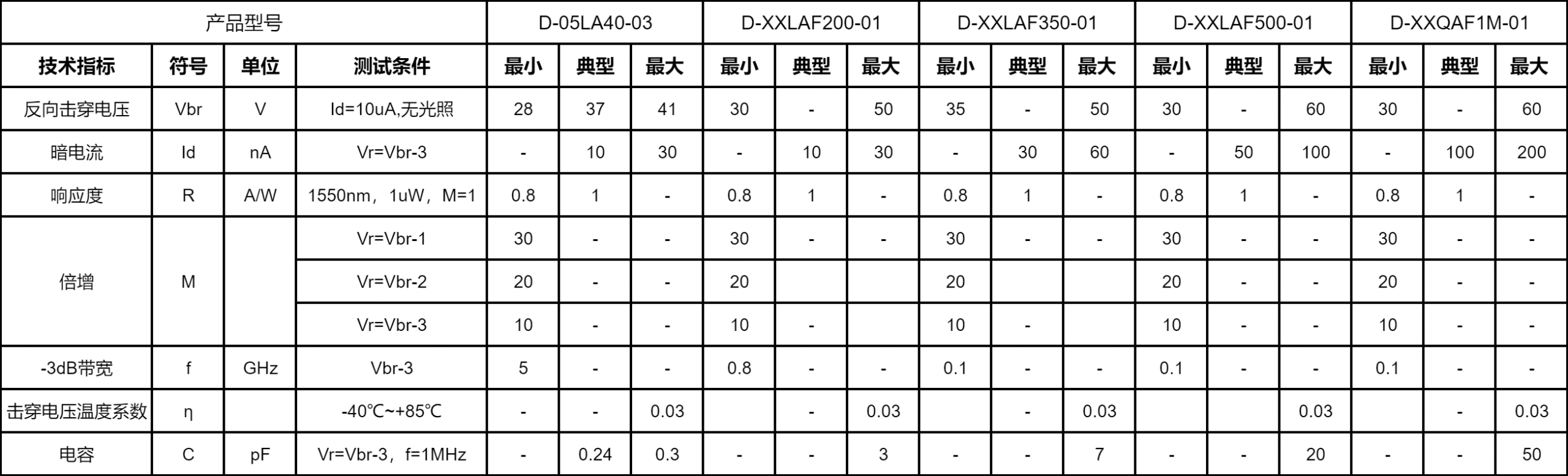 高性能正照台面型结构的InGaAs/InAlAs APD 光电二极管芯片系列,具有高响应度、高增益、低暗电流和高可靠性等特点,可用于人眼安全激光雷达等领域。可提供APD裸芯、TO封装,接受定制化服务开发。