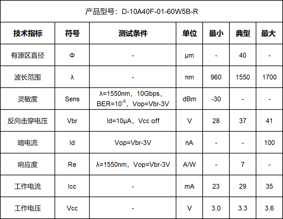 采用高性能10G APD、5PIN TO46底座和水滴球帽、50um多模尾纤封装,工作维度稳定。