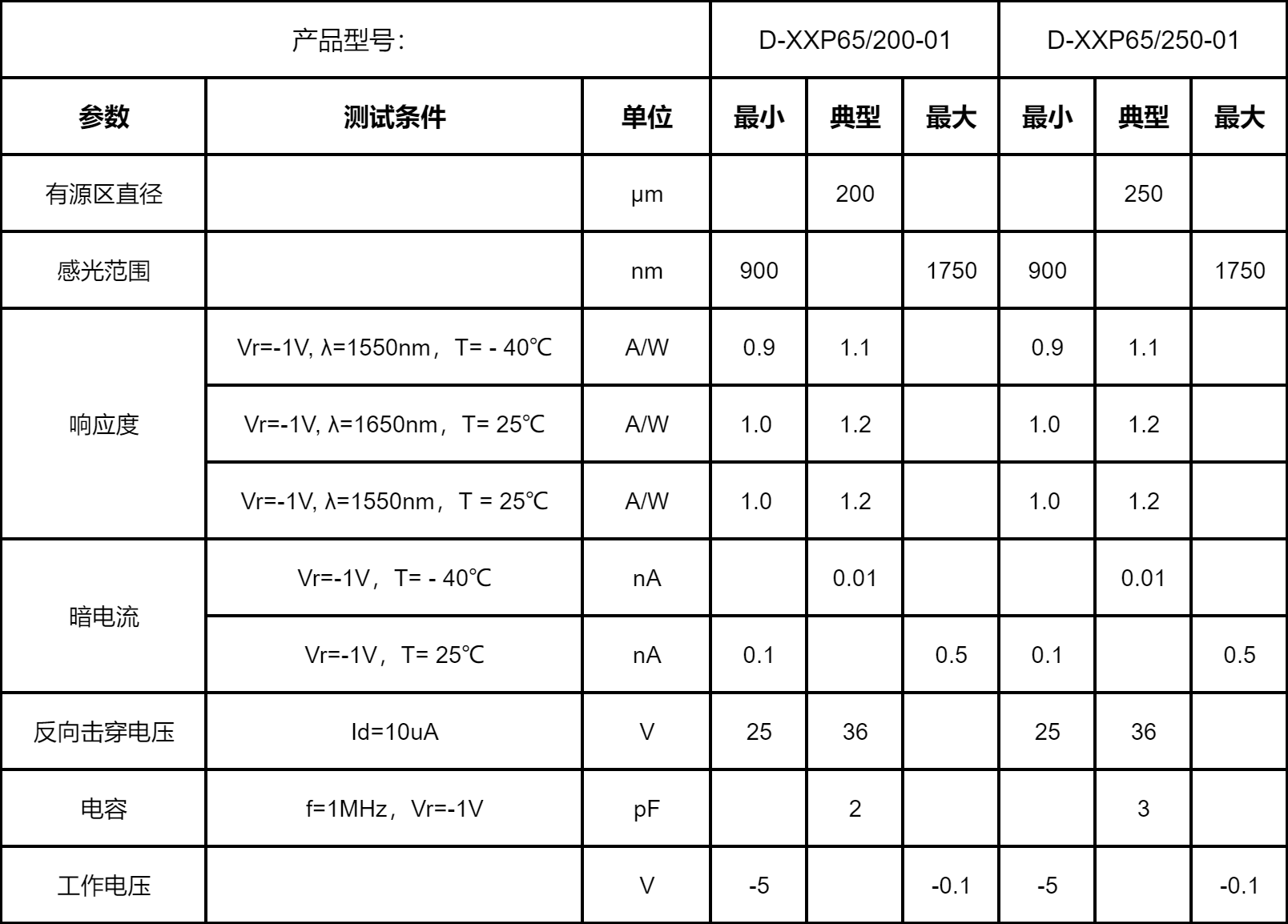 产品中心 首页 产品中心 智能传感 1654nm PD光电二极管芯片系列 超低暗电流PD是一款正照式光电二极管芯片,工作波长优化在1654nm,导电衬底,一个电极,光敏面尺寸200um、250um。 产品特点 高响应度 超低暗电流 扩展工作波长 应用领域 光功率计 仪器仪表 激光雷达 产品性能指标