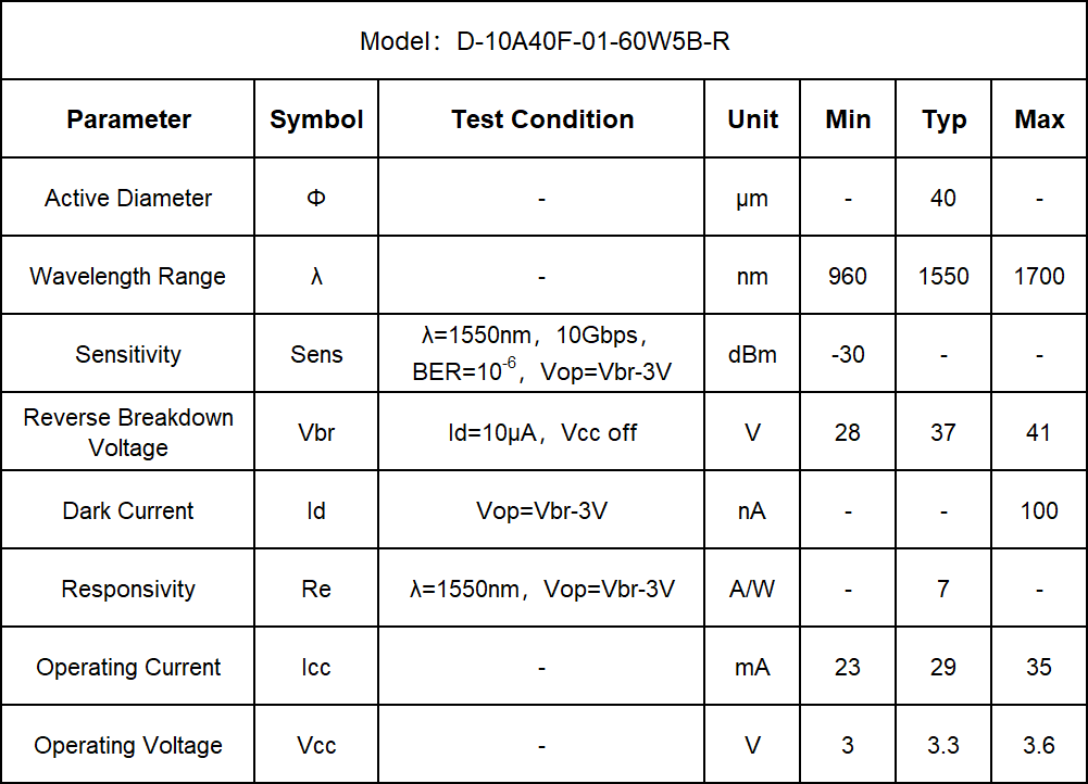 Product Center Home Product Center Optical Communication 10G ROSA Packaged with a high-performance 10G APD, 5-pin TO46 base, hemispherical lens, and 50μm multimode pigtail, ensuring stable operation across industrial temperature ranges. Features 10G APD Chip High Responsivity Low Dark Current High Reliability Application Area Fiber Optic Communication Characteristics