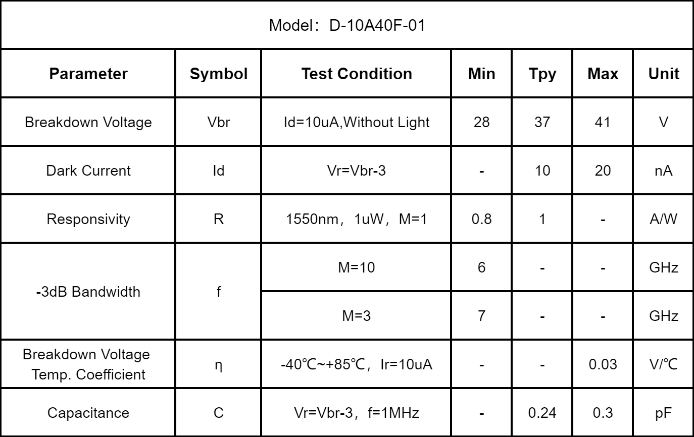 The 10Gbps APD chip features a front-illuminated mesa structure with a 40μm active area diameter. It delivers high bandwidth, high responsivity, and high reliability, meeting the requirements for 10Gbps data communication rates.