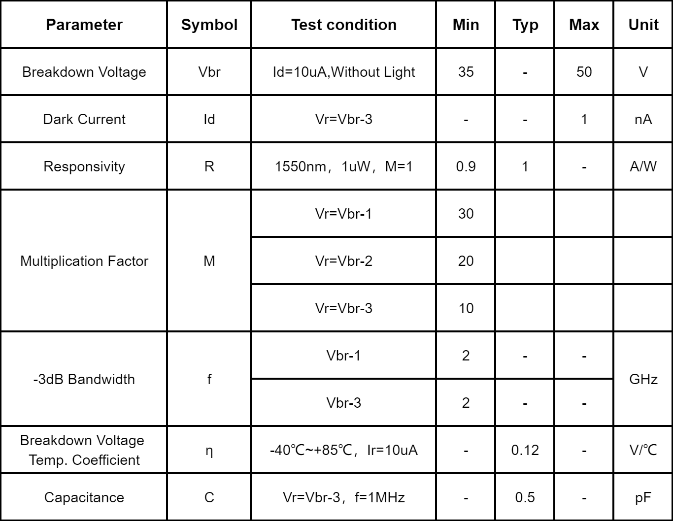 The 2.5Gbps APD chip features a forward-illuminated planar structure with a bare die and PN junction electrodes on different planes. It offers high bandwidth, high responsivity, and high reliability.