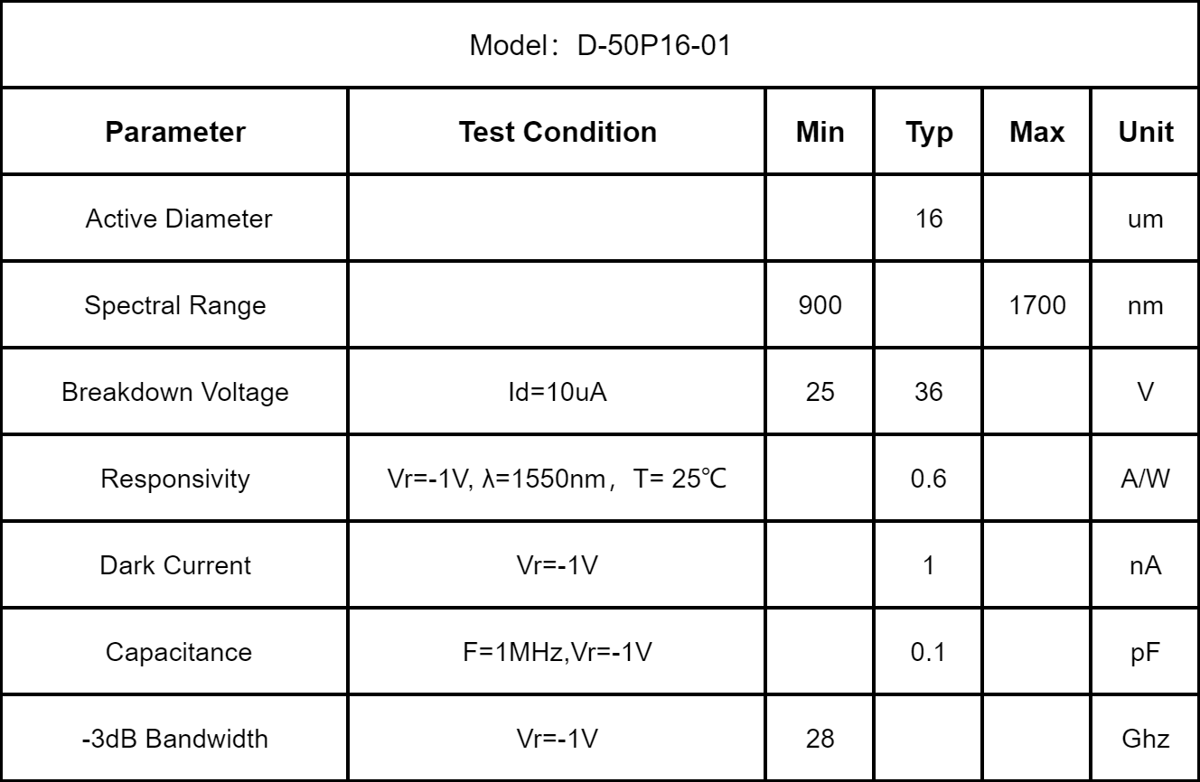50Gbps InGaAs PIN Photodiode,This front-illuminated photodiode chip utilizes a semi-insulating substrate with coplanar electrodes, featuring a 16 μm photosensitive area. It is designed for high-speed data communication applications requiring 50Gbps performance.